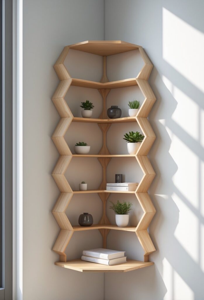 You can add a unique touch to your corner with a geometric hexagon tree shelf. These shelves fit snugly into corners and offer space for small plants or decorations.