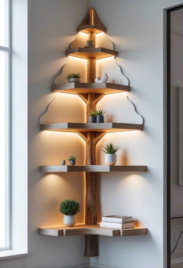 You can brighten up your space with a tree-shaped corner shelf that has built-in lights. This type of shelf not only saves room but also adds a warm glow to your favorite items.