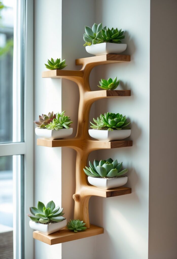 You can use a small floating tree shelf to show off your succulents in a unique way. These shelves fit well in corners, making good use of space while adding a natural touch to your room.