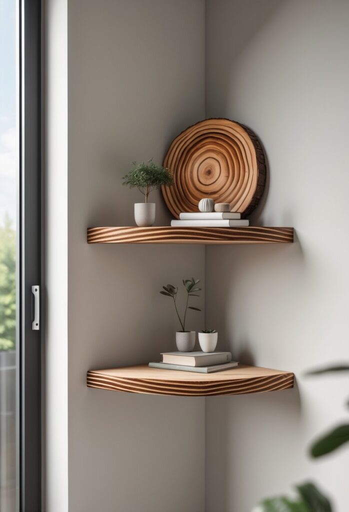 You can create a unique shelf by using a slice of tree trunk with visible rings. The natural rings add texture and a cool pattern to your corner space.