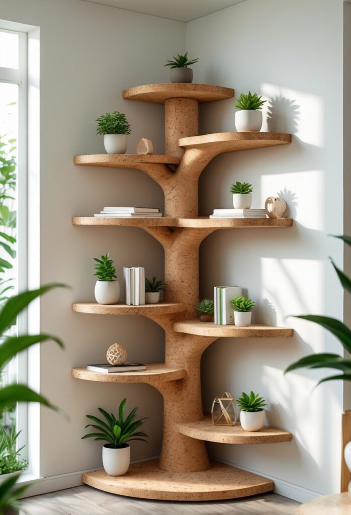 14. Eco-Friendly Cork Tree Corner Shelf