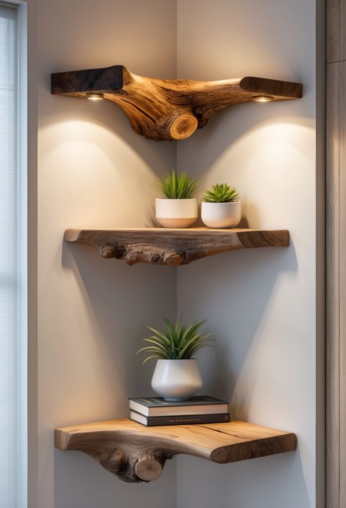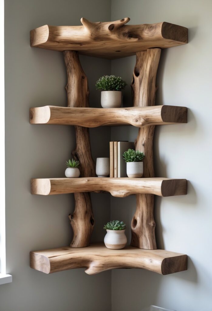 You can add a warm, natural touch to your room with a live edge tree branch corner shelf. Its organic shape fits nicely in corners and shows off the wood’s natural beauty.