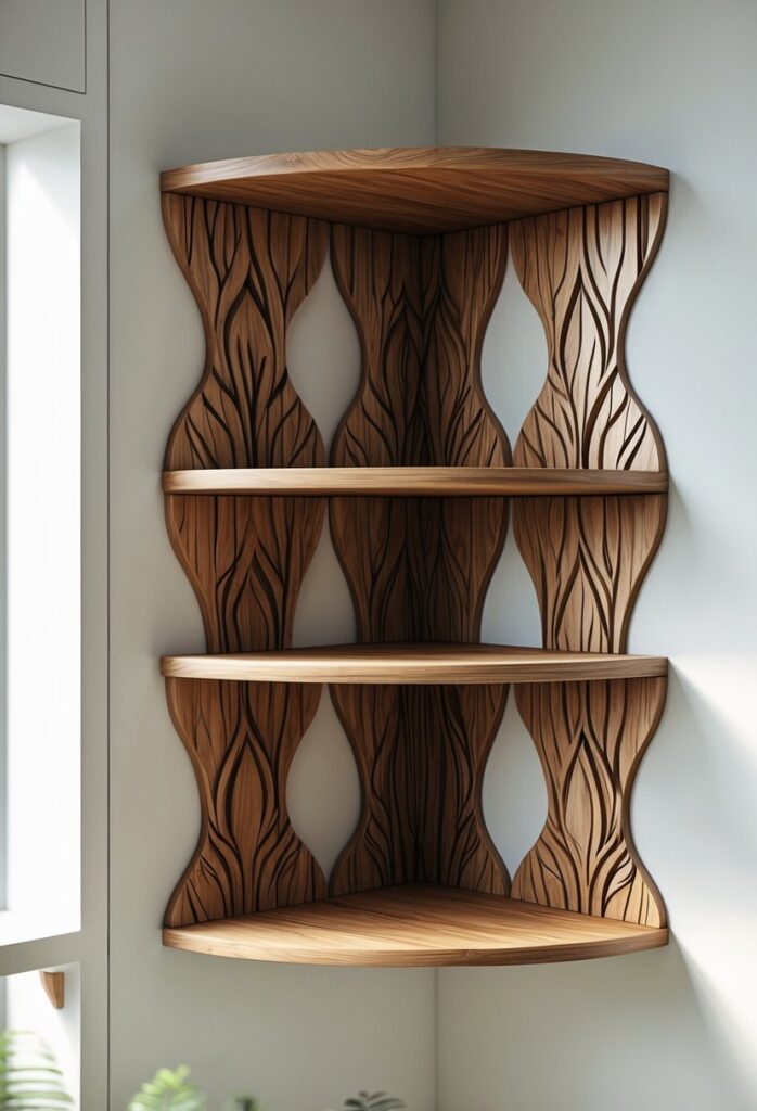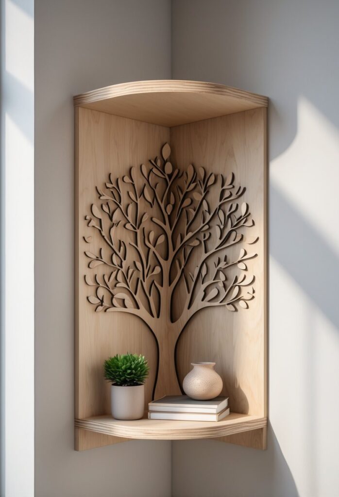 You can add a fresh look to your corner with a tree leaf pattern shelf. This design uses shapes inspired by leaves to create a natural feel. It works well if you want something unique but simple.