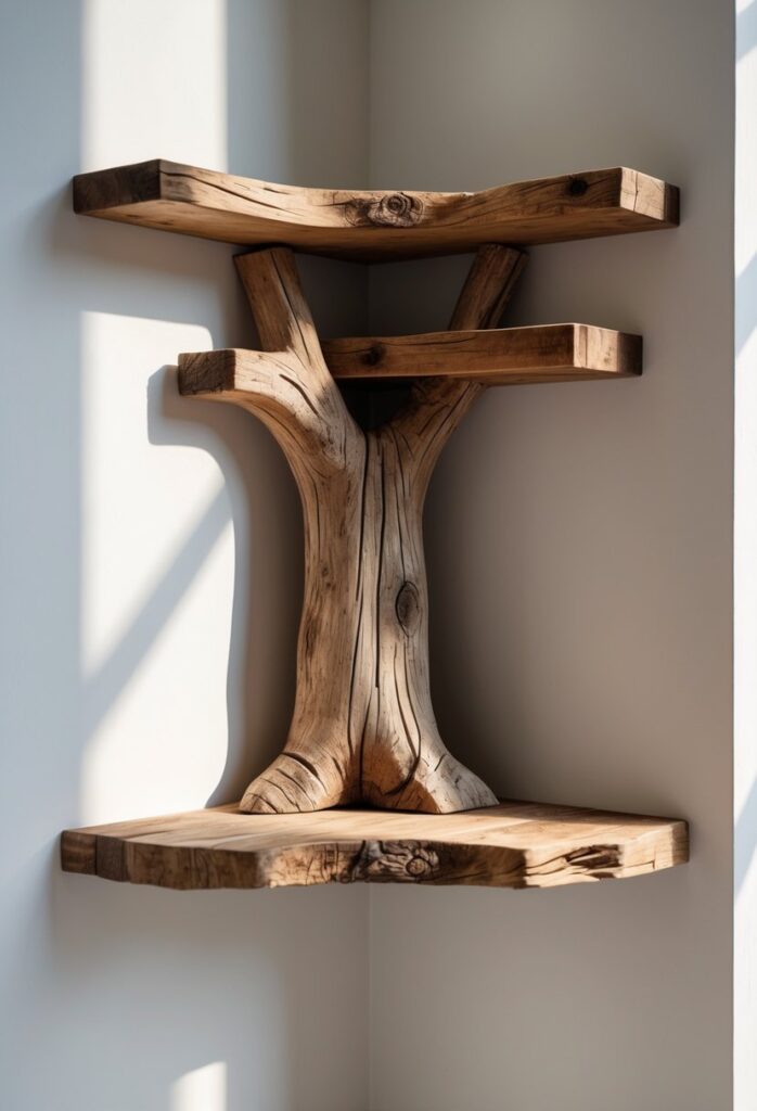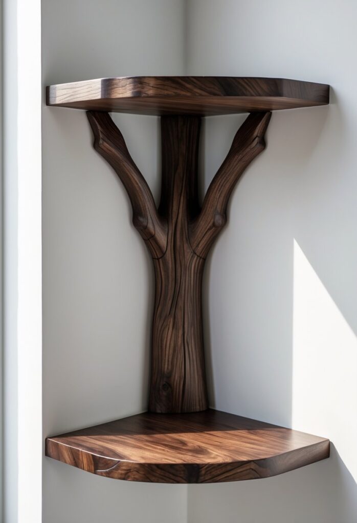 You’ll love how a dark walnut tree branch corner shelf adds warmth to your space. Its rich color works well with many styles, from modern to rustic.