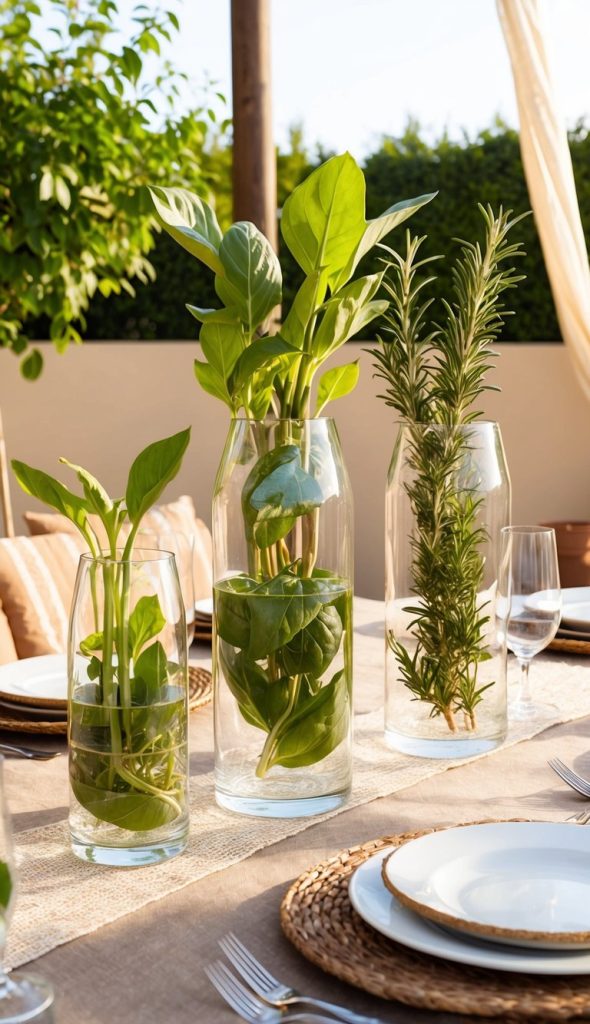 Tap into the gardening trend of propagating plants in water and use it as a design feature. Fill tall, narrow glass vases with garden cuttings like pothos, basil, or rosemary for a fresh, minimalist look.
