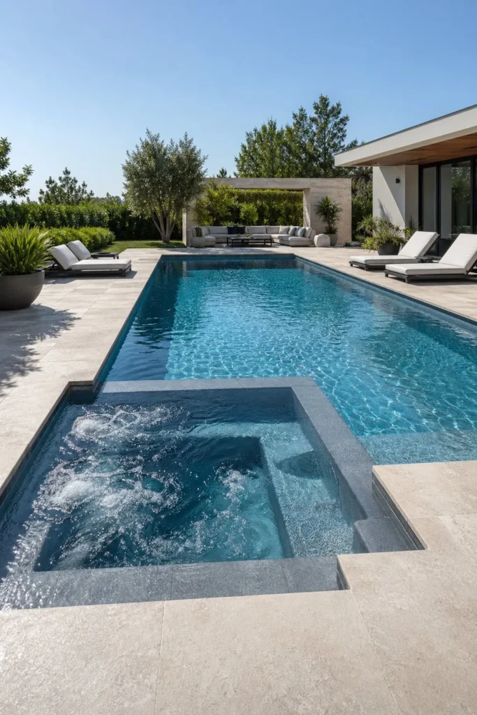 A rectangular pool with spa gives you a clean, high-end look that fits modern homes beautifully. The built-in spa sits flush with the pool shell, so the waterline, coping, and tile feel seamless. Add pale stone decking and low-profile loungers for a crisp resort finish.