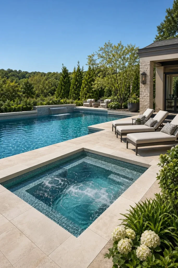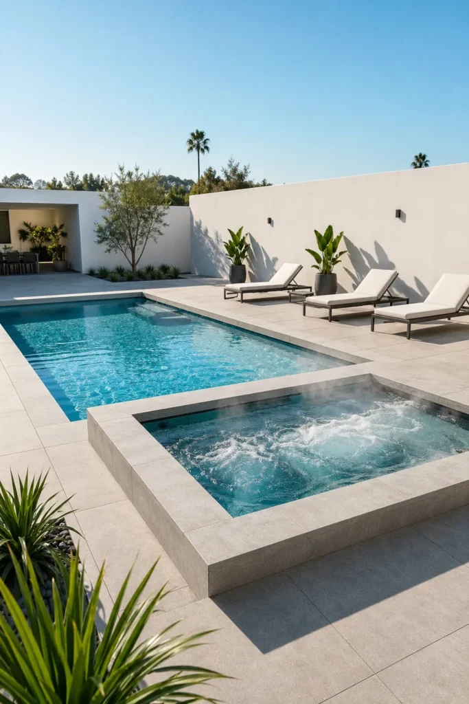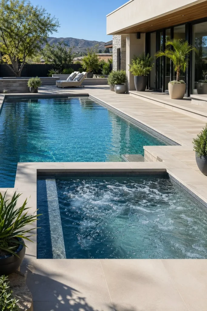A contemporary combo works best when the pool and spa share one strong shape language. Think square corners, large-format pavers, simple coping, and a flat waterline. This style looks especially sharp beside modern architecture and black-framed glass doors.