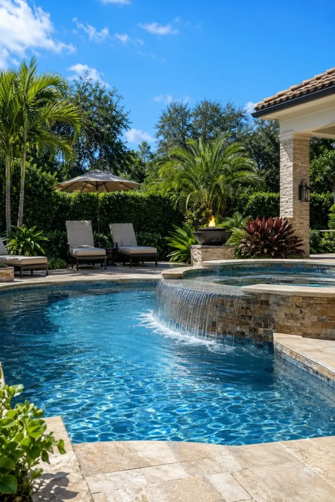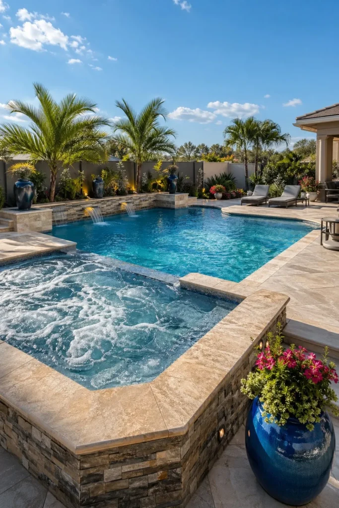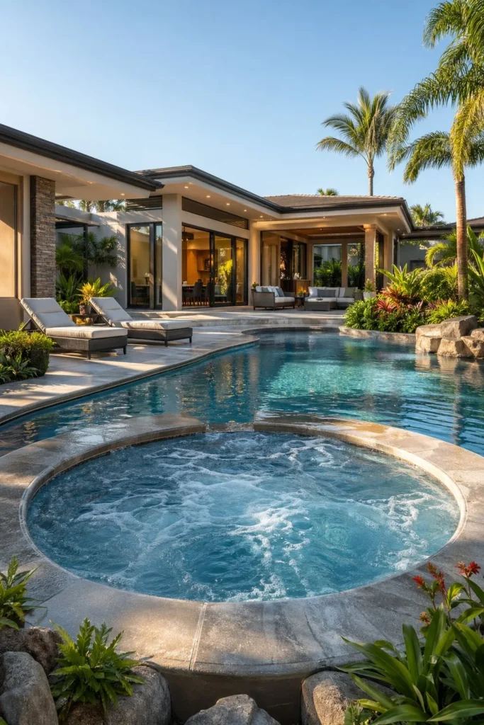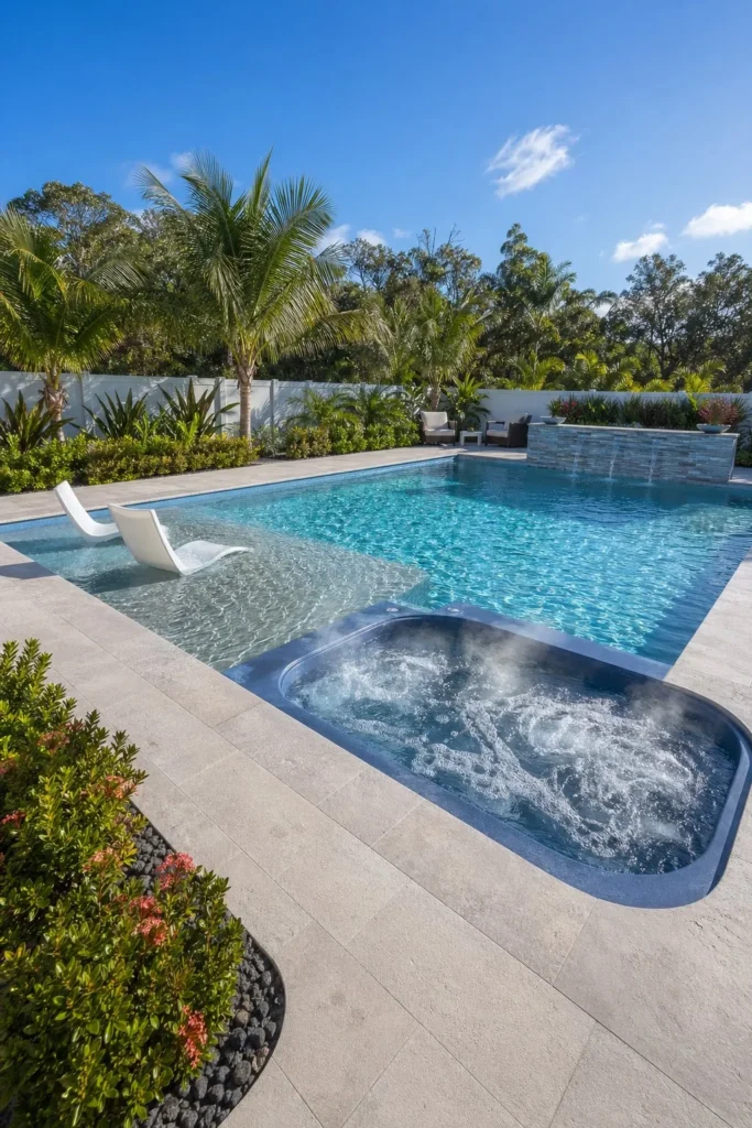 A hidden spa gives your pool area a more organic, tucked-in feel. You can nestle the hot tub behind palms, ornamental grasses, or a low privacy wall while still keeping it connected to the pool deck and finishes. This layout works beautifully with lagoon-style water features and lush planting.