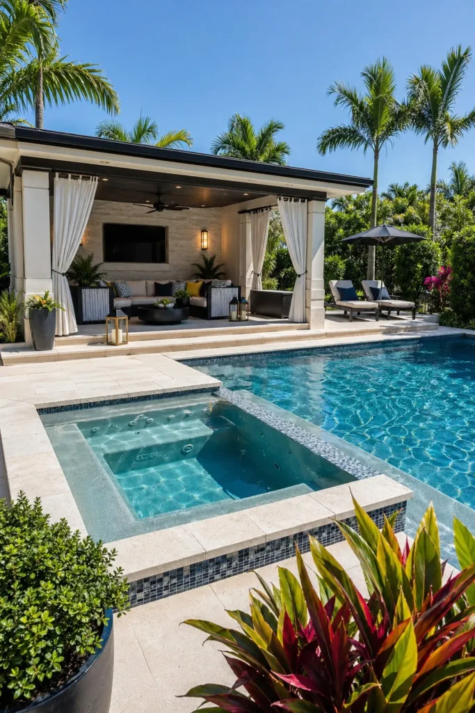 A cabana turns your pool and spa area into a real outdoor living zone. Place it where you can step out of the hot tub and move straight to shade, drinks, or a lounge bed. Matching fabrics, stone, and wood tones help the pool, spa, and structure feel like one design story.