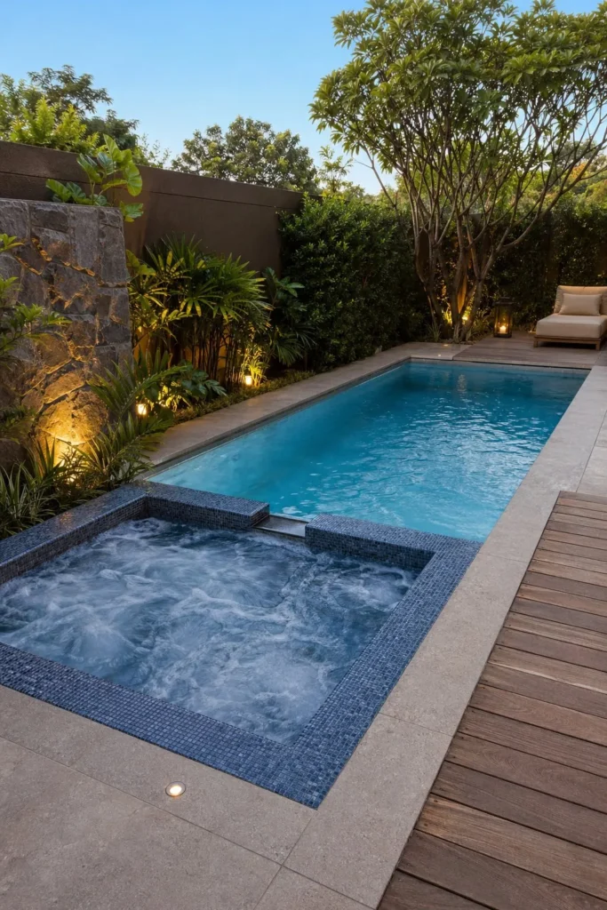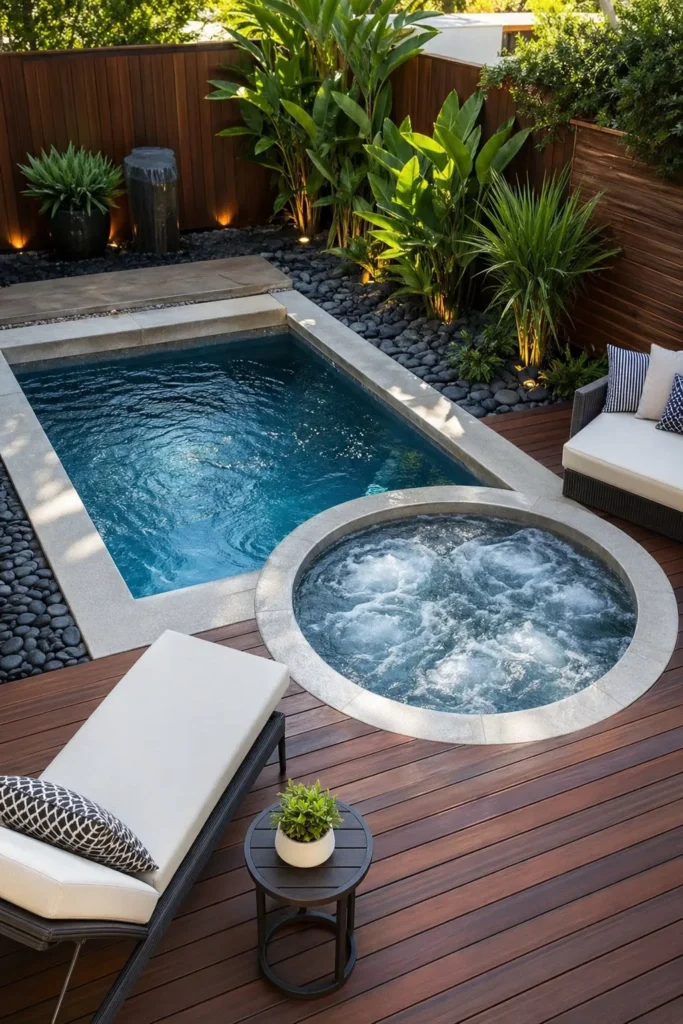 A small pool and hot tub combo can still feel refined when the shapes are scaled carefully. Keep the spa attached to one end of the pool so the layout feels connected, not crowded. Built-in bench seating, slim coping, and vertical landscaping help the yard feel open.