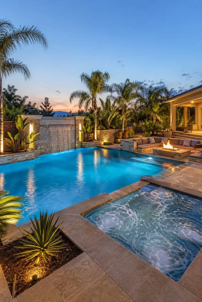 If you want a true pool jacuzzi combo backyard, pair the connected spa with a nearby fire pit lounge. The warm water and fire feature balance each other and extend how often you use the space. Keep seating close enough to feel social, while leaving clear walking paths around the pool deck.