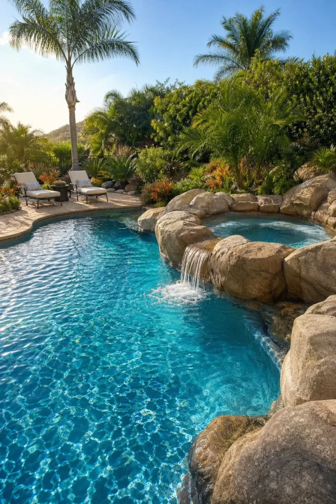 A freeform pool softens the backyard, while a rock-wrapped spa adds texture and warmth. To keep the integration feeling intentional, repeat the same stone on the pool edge, steps, or waterfall. Lush greenery and curved planting beds make the whole space feel tucked away and private.