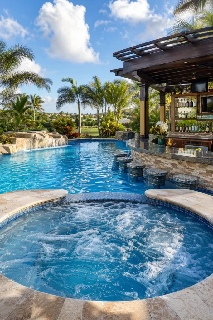 A swim-up bar brings a resort mood to your pool jacuzzi combo backyard. Place the spa close to the bar zone so the space feels social and connected, especially for evening gatherings. Use matching tile, underwater stools, and soft accent lighting to make the layout feel custom.