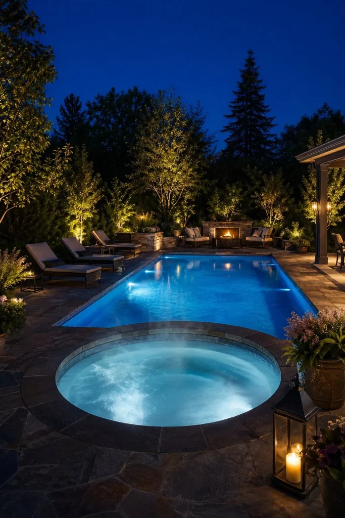 Lighting changes everything once the sun goes down. Underwater LEDs, step lights, and uplighting on nearby trees help the pool and hot tub read as one beautiful nighttime feature. Warm white tones keep the look calm and refined.