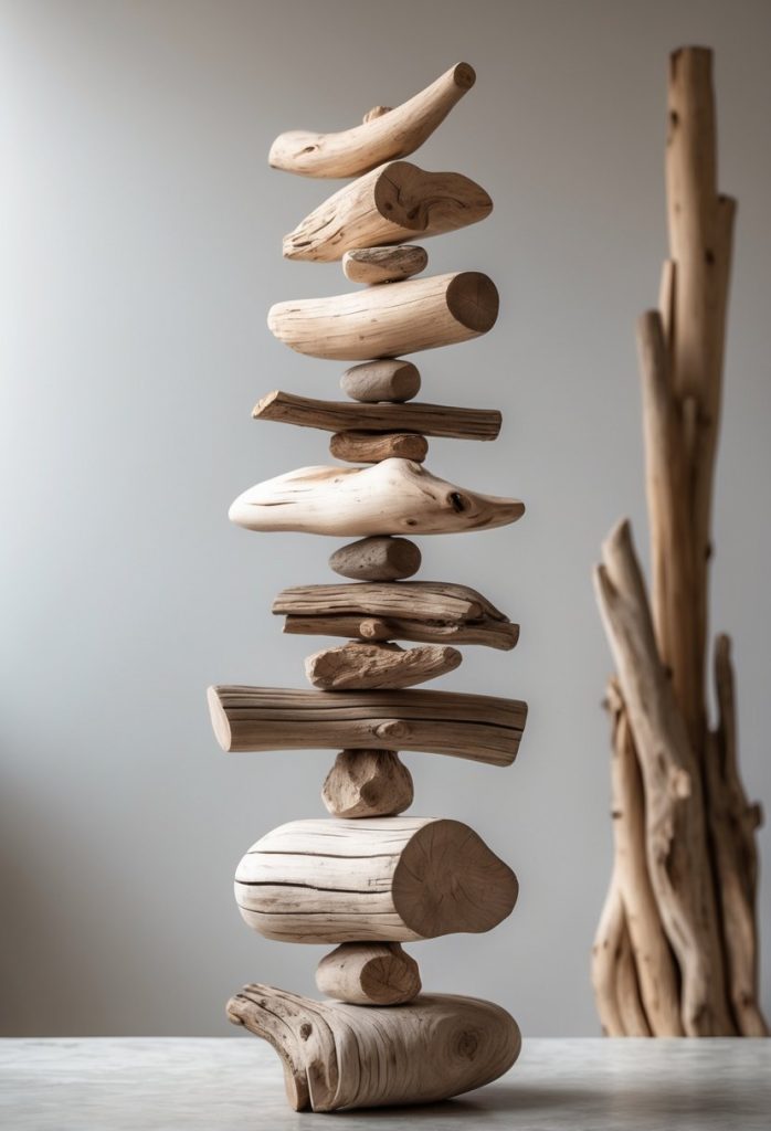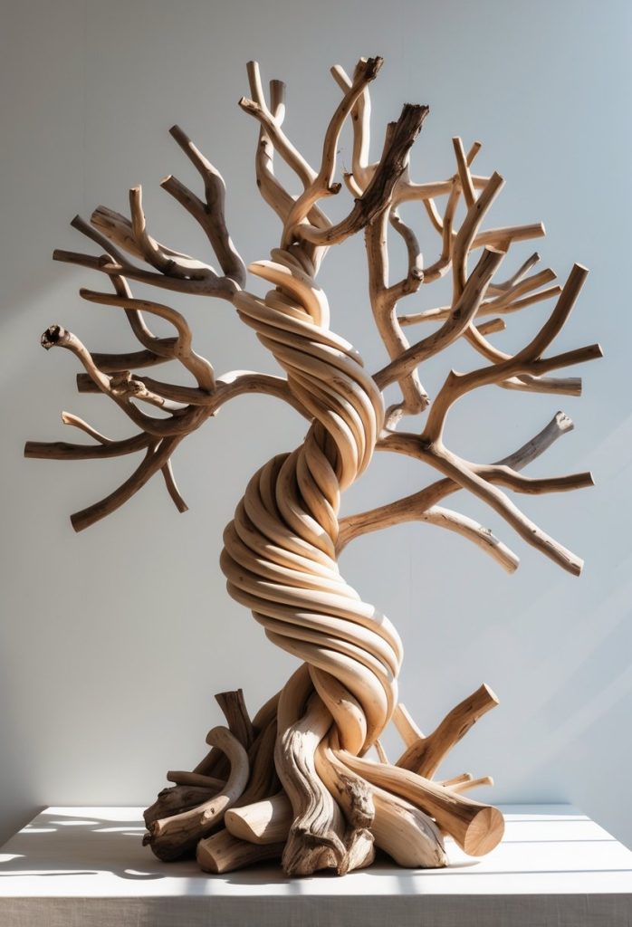 You can create a beautiful spiral tree using pieces of driftwood twisted or stacked carefully. These sculptures bring a natural and modern look to your space.