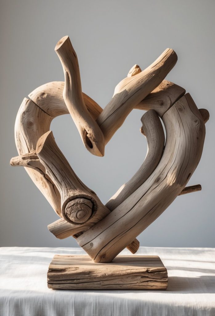 You can create a warm, natural feel with driftwood heart centerpieces. These pieces bring a simple, rustic charm to your table or shelf.