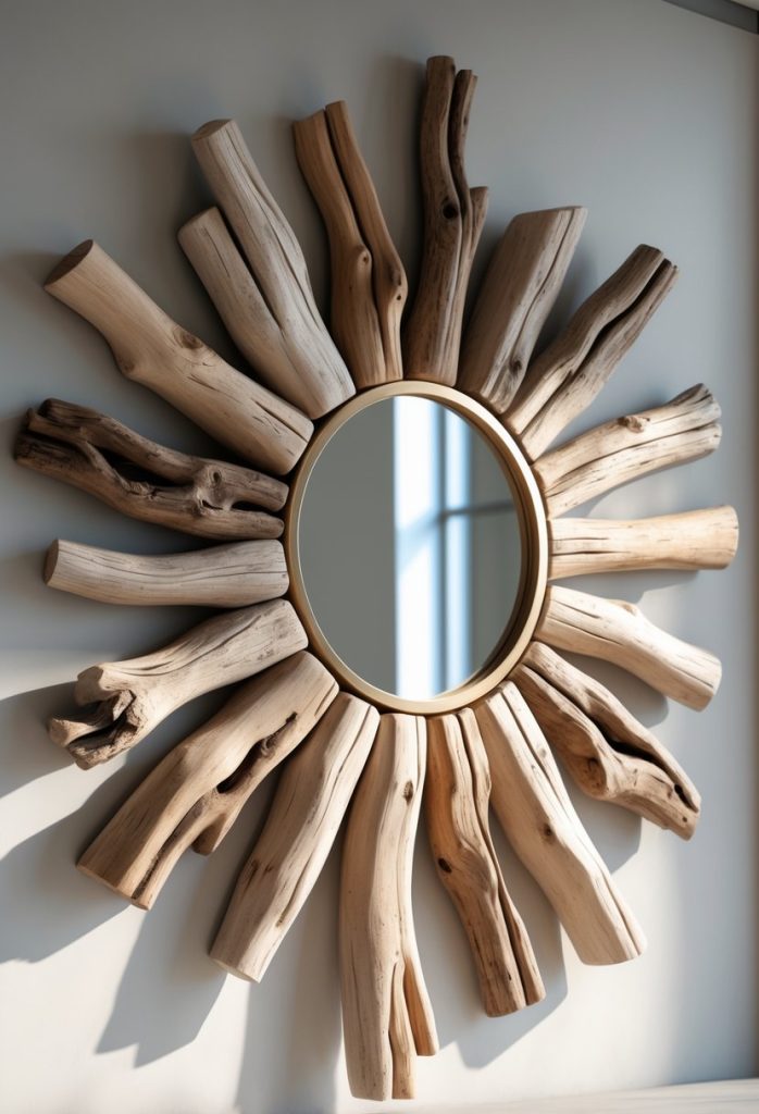 You can create a driftwood starburst mirror to add charm to your room. It uses pieces of driftwood arranged like rays around a mirror.