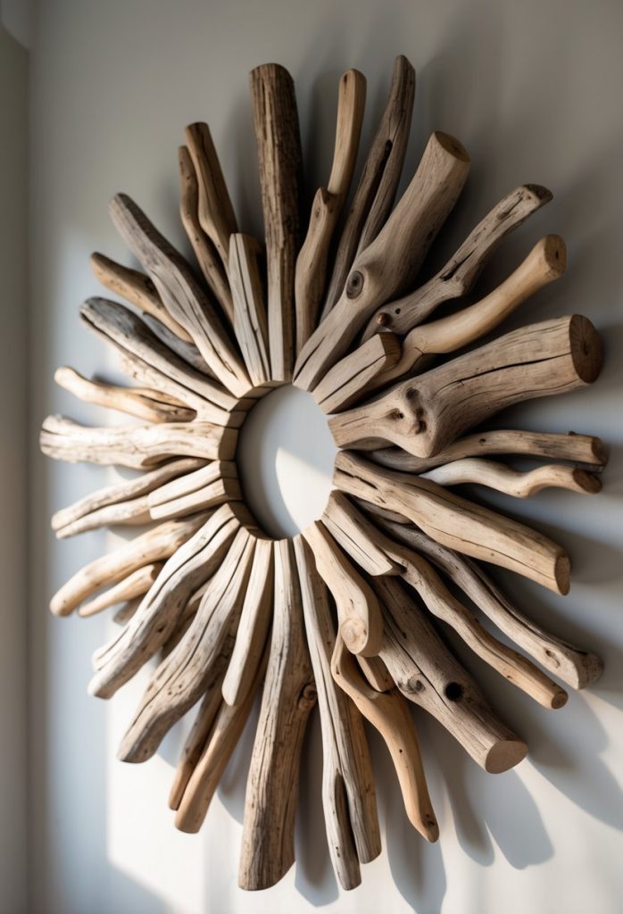 You can add a natural look to your space with driftwood sunburst wall decor. It usually features pieces of driftwood arranged like rays of the sun around a center point. This design brings a calm, warm feel to your room without much effort.