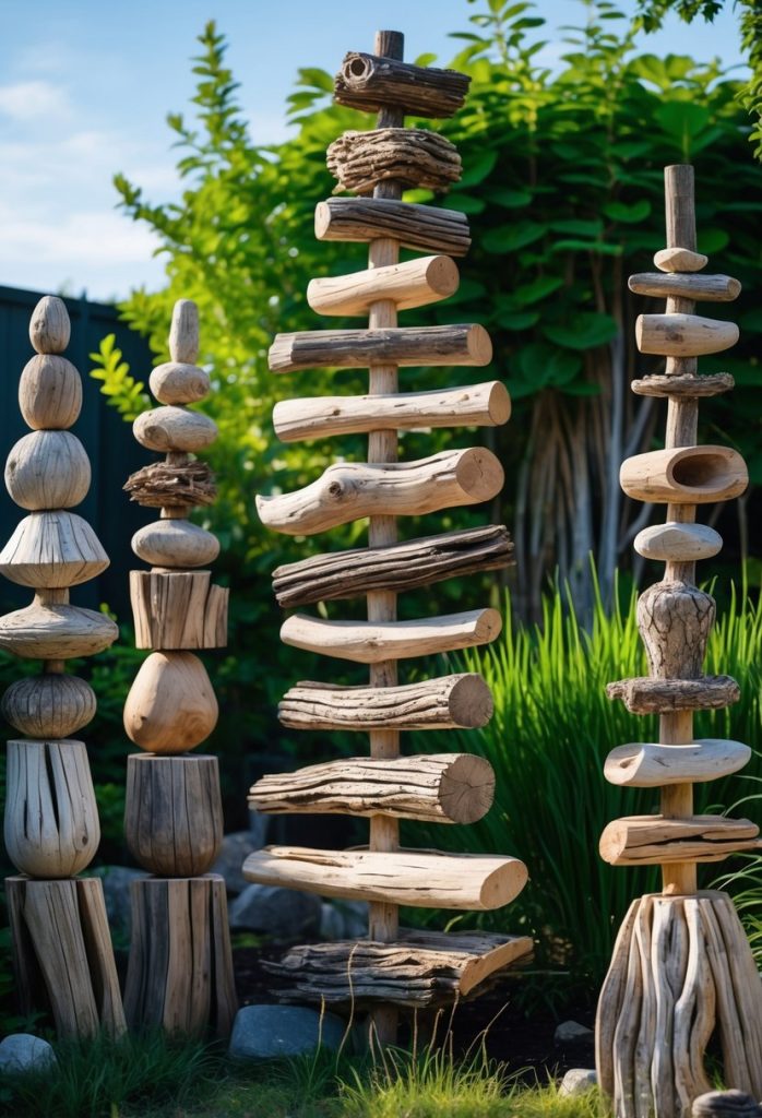 You can create driftwood garden totems by stacking pieces of wood vertically. These totems add a natural, rustic look to your outdoor space.