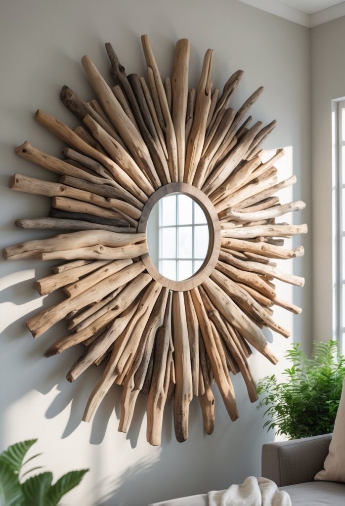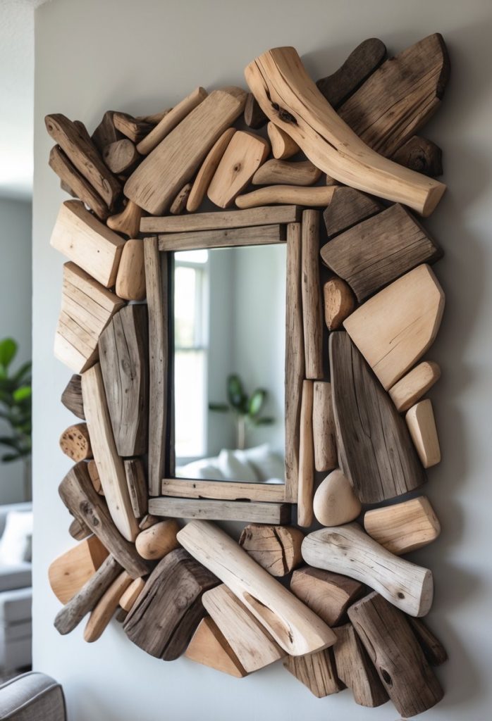 You can create a unique look by combining driftwood with a mirror frame. The natural texture of driftwood adds a rustic touch that fits well with many styles.