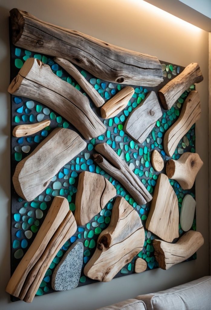 You can create a beautiful mosaic using driftwood and sea glass. The natural textures of driftwood mixed with colorful sea glass add a calm, coastal feel to your living room.