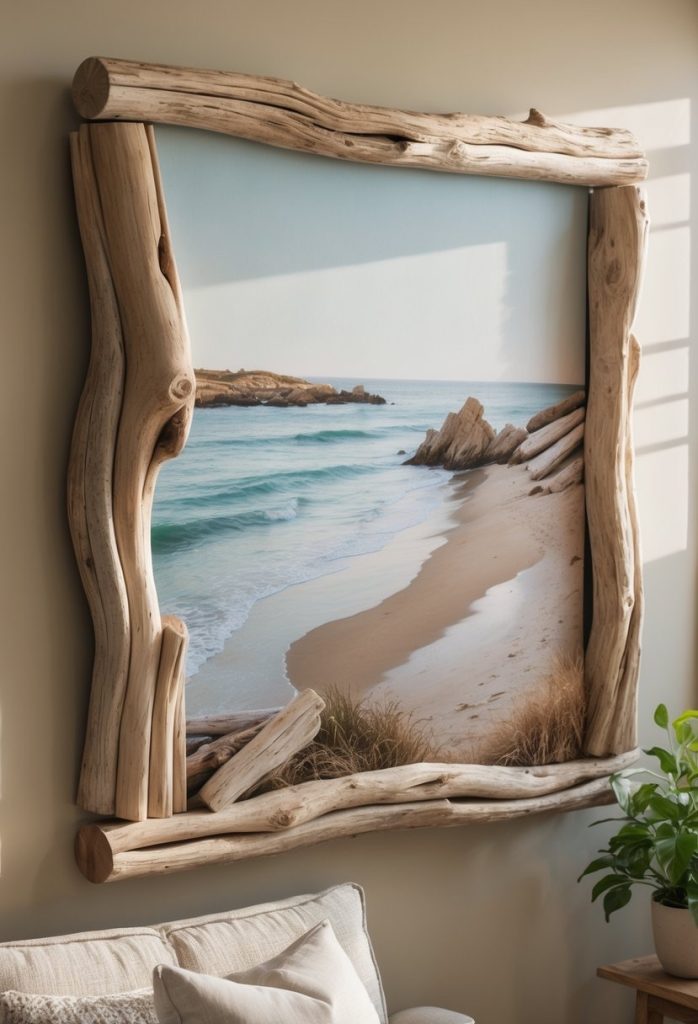 You can create a unique photo display using a canvas framed with driftwood. The natural texture adds a rustic feel to your living room.