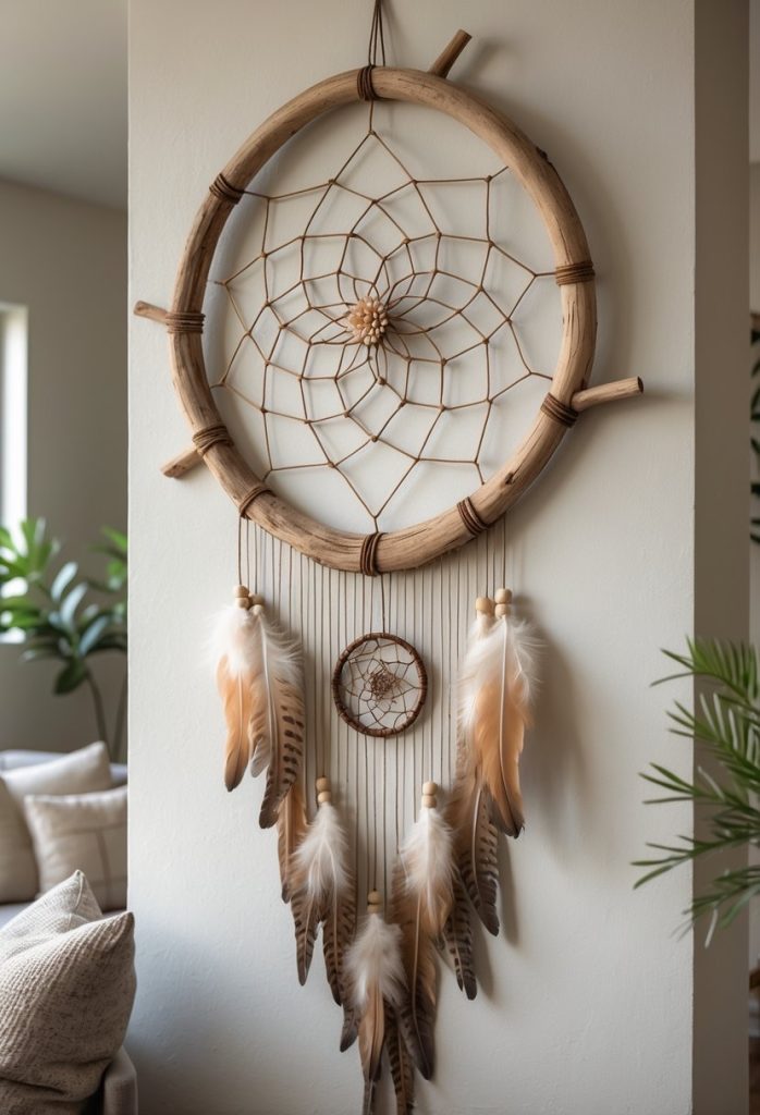You can add a peaceful vibe to your living room with a driftwood dreamcatcher. The natural wood mixed with soft threads creates a beautiful, calming look.
