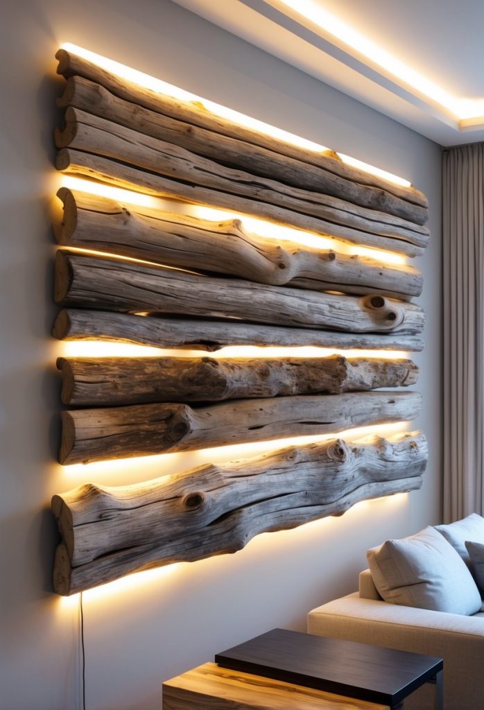 You can add a warm glow to your living room with a driftwood panel that has built-in LED lights. The natural wood pairs well with soft lighting to create a cozy feel.