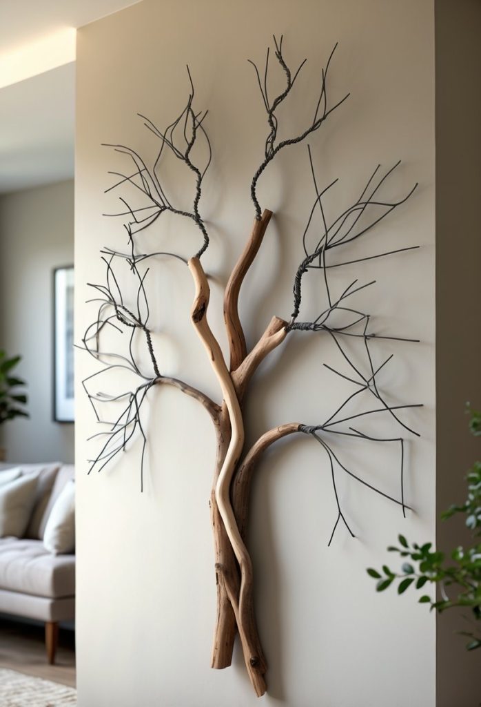 You can create a simple driftwood art piece using wire and small branches. The wire shapes the tree silhouette, while driftwood adds a natural and rustic feel. This combo works well in your living room, bringing a bit of nature inside without much effort. It’s a nice way to add texture and interest to your walls.