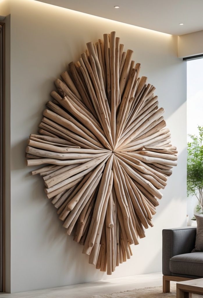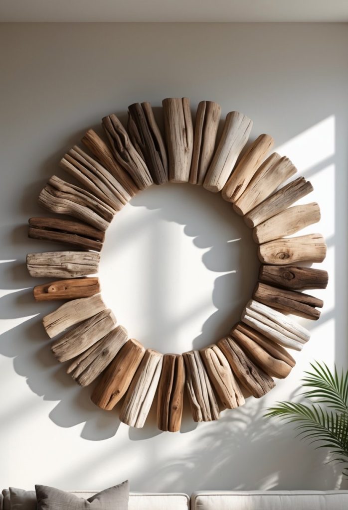 You can add balance to your living room with symmetrical driftwood circle art. This style uses carefully arranged pieces to create a neat, even shape.