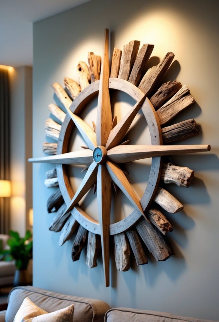 You can add a driftwood nautical compass wall piece to bring a coastal touch to your living room. This art combines natural wood with the classic compass shape.