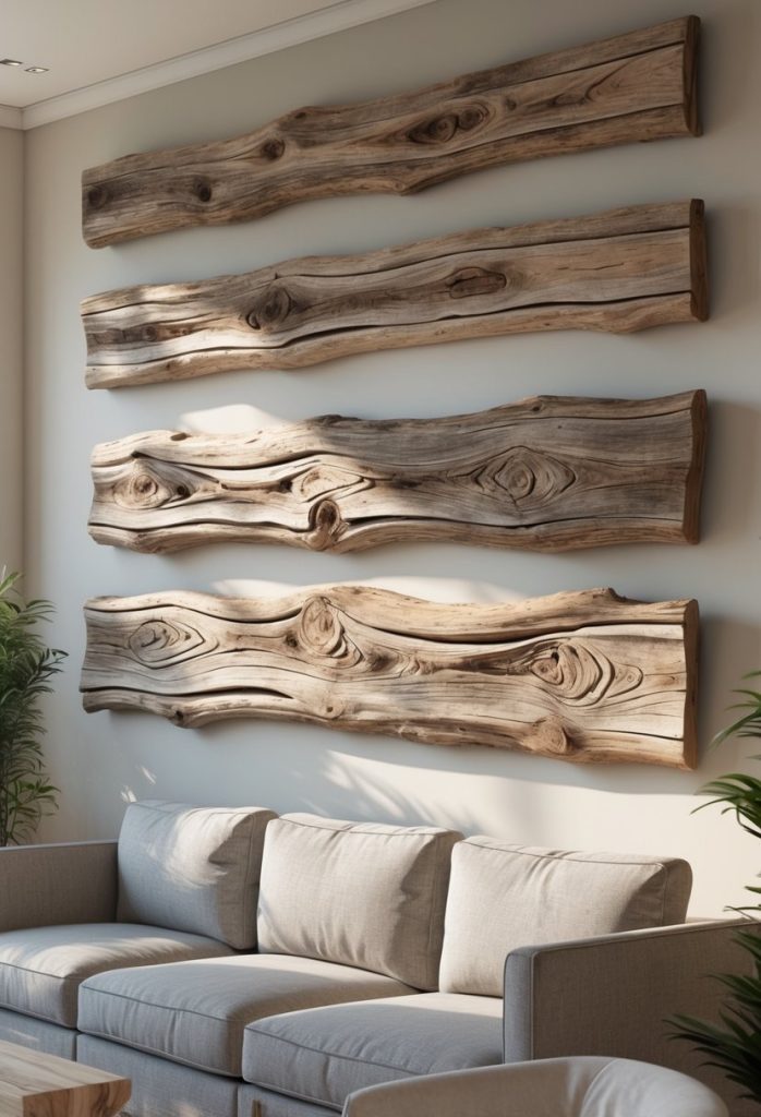You can create a striking look by layering driftwood planks on your wall. Each plank adds natural texture and depth, making your living room feel cozy and fresh.