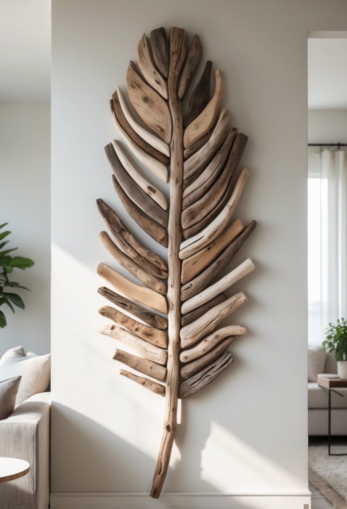 You can add a natural touch to your living room with driftwood feather-shaped wall art. These pieces combine the soft shape of a feather with the rough texture of wood. They work well in beachy or boho-style rooms.