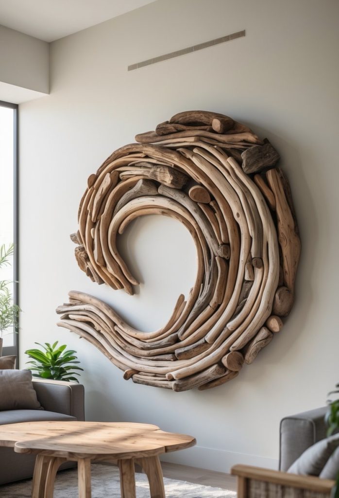 You can add a calm, natural look to your living room with an organic driftwood wave wall hanging. The flowing shapes of the wood pieces mimic ocean waves, bringing a peaceful vibe indoors.