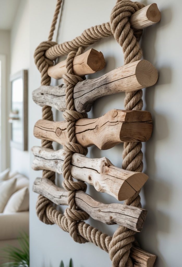 The rope adds a simple way to hang the driftwood, keeping your decor casual and coastal. This style fits well in living rooms that need a bit of calm, seaside charm.