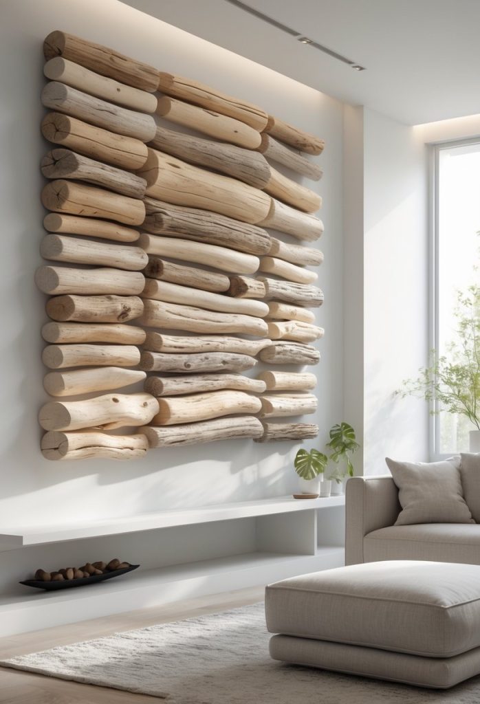 You can create simple, elegant designs using thin pieces of driftwood. These pieces form clean lines that add a peaceful vibe to your living room.