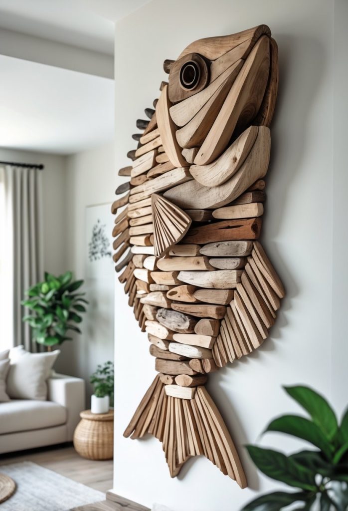You can add a simple, coastal feel with a fish-shaped driftwood wall accent. It fits well in living rooms, bedrooms, or even bathrooms.