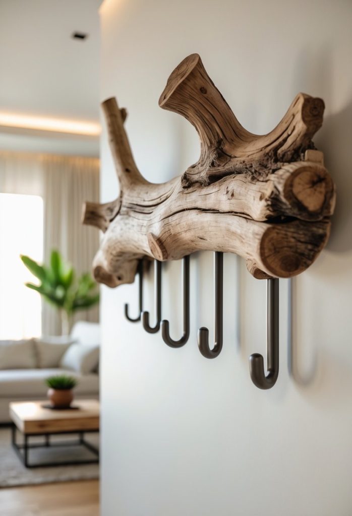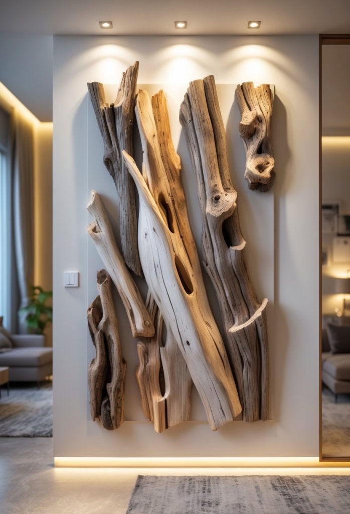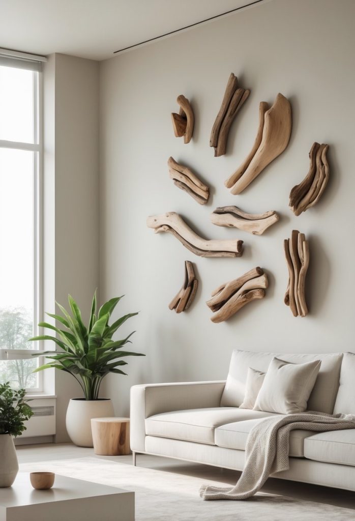 Minimalist driftwood art works well on plain walls, giving a natural touch without clutter. It’s a great way to bring texture and warmth while keeping things calm and stylish.