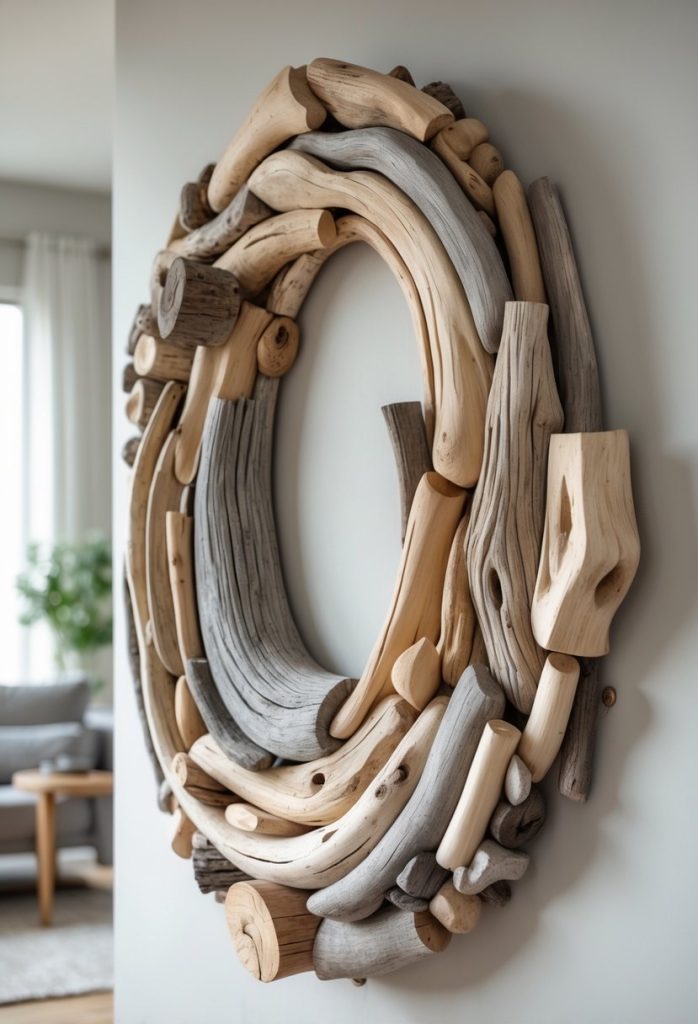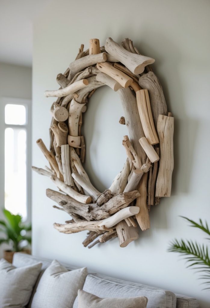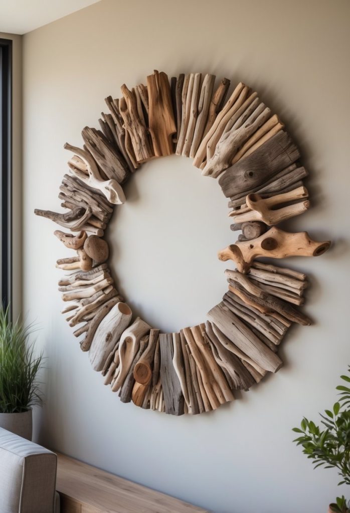 You can create a soft, natural look with a circular driftwood frame collage. Arrange small pieces of driftwood in a round shape to make a unique frame for photos or artwork.