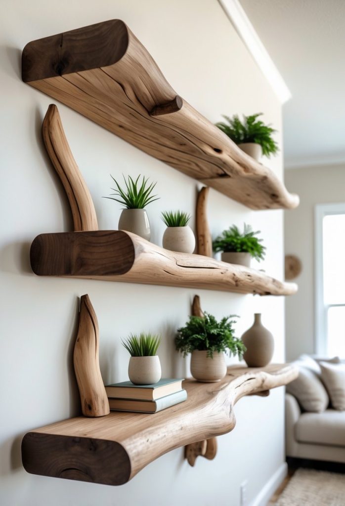 You can add charm to your living room by choosing driftwood shelves with natural curves. These shelves keep the wood’s original shape, making each one unique.
