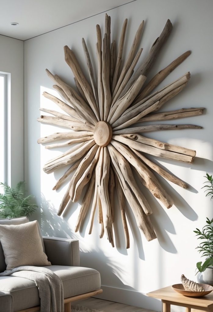 You can add a natural touch with a driftwood starburst wall decoration. It’s made from pieces of driftwood arranged in a sunburst pattern.