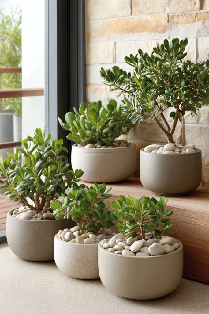 Try placing them in small pots or mixed containers with stones to save room. Jade plants also work well in decorative planters that fit your style.