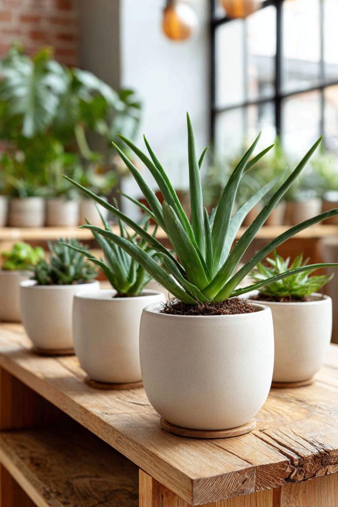 You can brighten a small indoor space with aloe vera in small pots. These plants need pots that are slightly wider than their base to give roots room to grow. Terracotta pots are a good choice because they help soil dry out between watering.