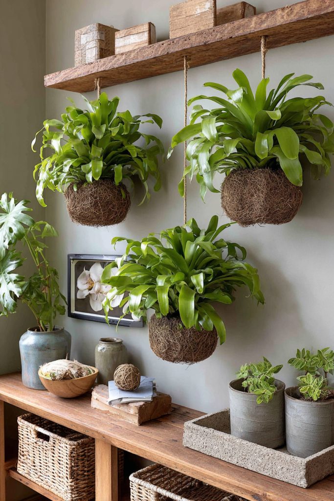 The fern’s unique antler-shaped leaves stand out when displayed this way. Just make sure to mist them often and keep them in indirect light. They’re low maintenance and brighten up tight spaces nicely.