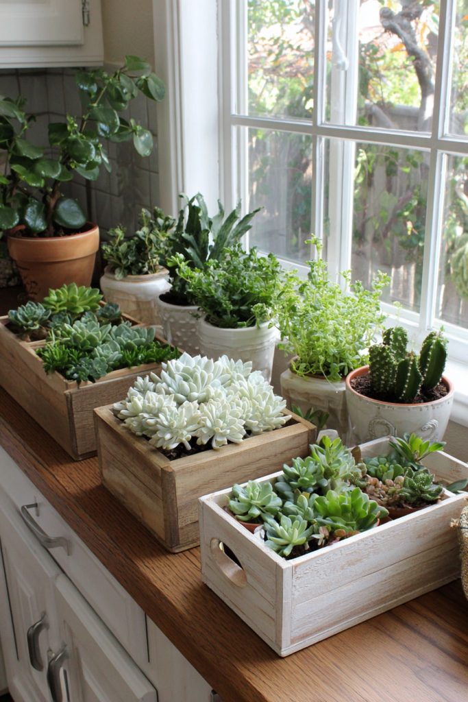 You can mount succulent boxes right on your kitchen window to save space. Succulents need bright light, and windows are perfect for that.