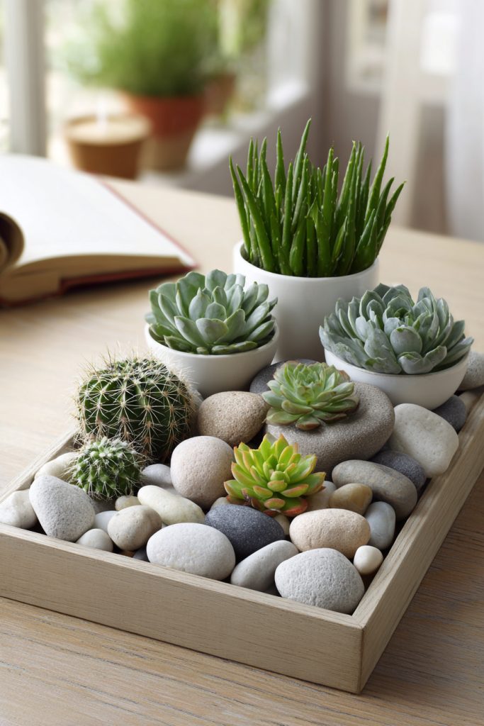 Arrange small rocks and sand in a shallow tray or dish. You can add a few tiny succulents or air plants to keep it low-maintenance and fresh.