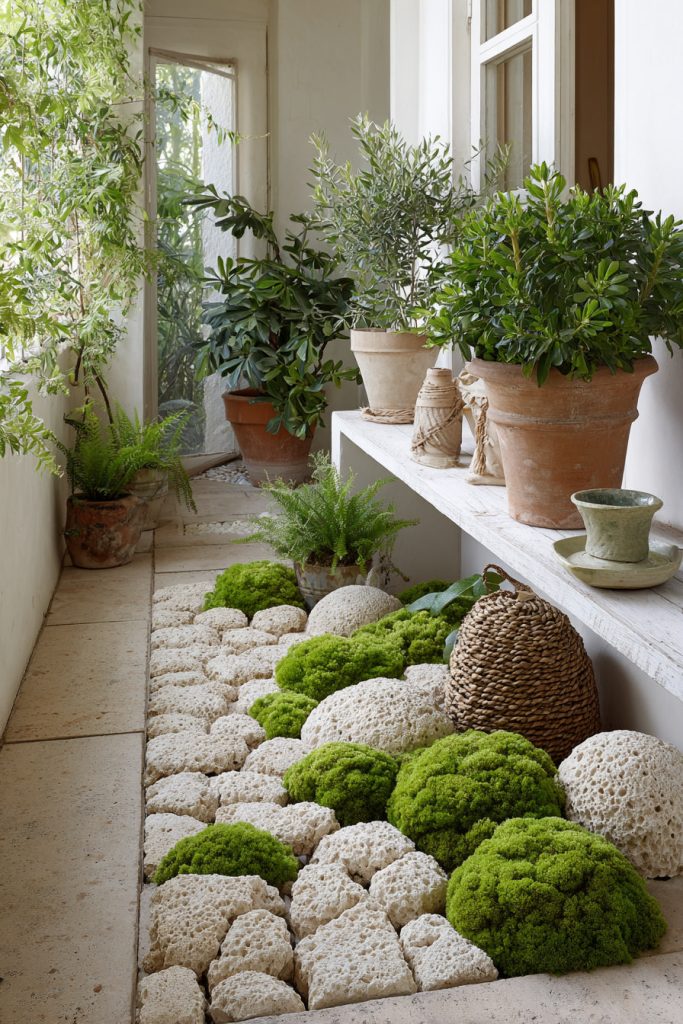 Arrange the coral stones to form a clear path, then place moss around them. It’s low maintenance and brings a calm, fresh look to your room.