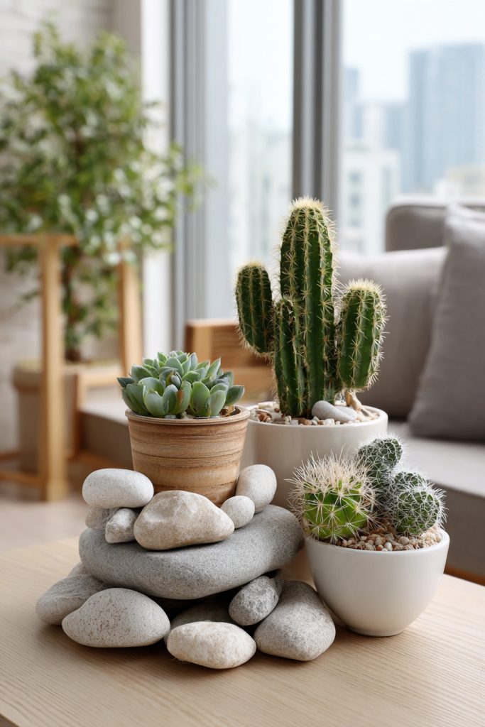 You can create small piles of sedimentary stones to build a natural base for your cacti. These stones add texture and a calm, earthy look to your indoor dry garden.