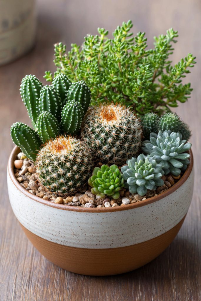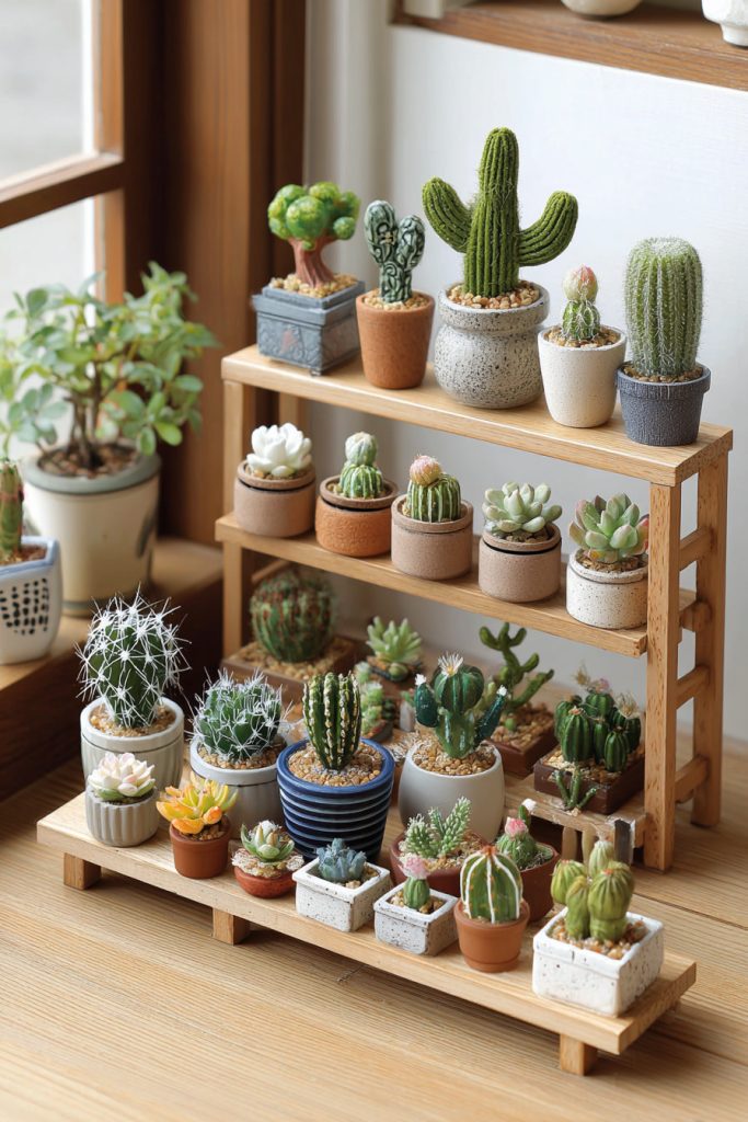 You can create a charming miniature cactus garden right on your shelves. Use small, shallow pots or bowls to arrange different tiny cacti with some gravel or pebbles.