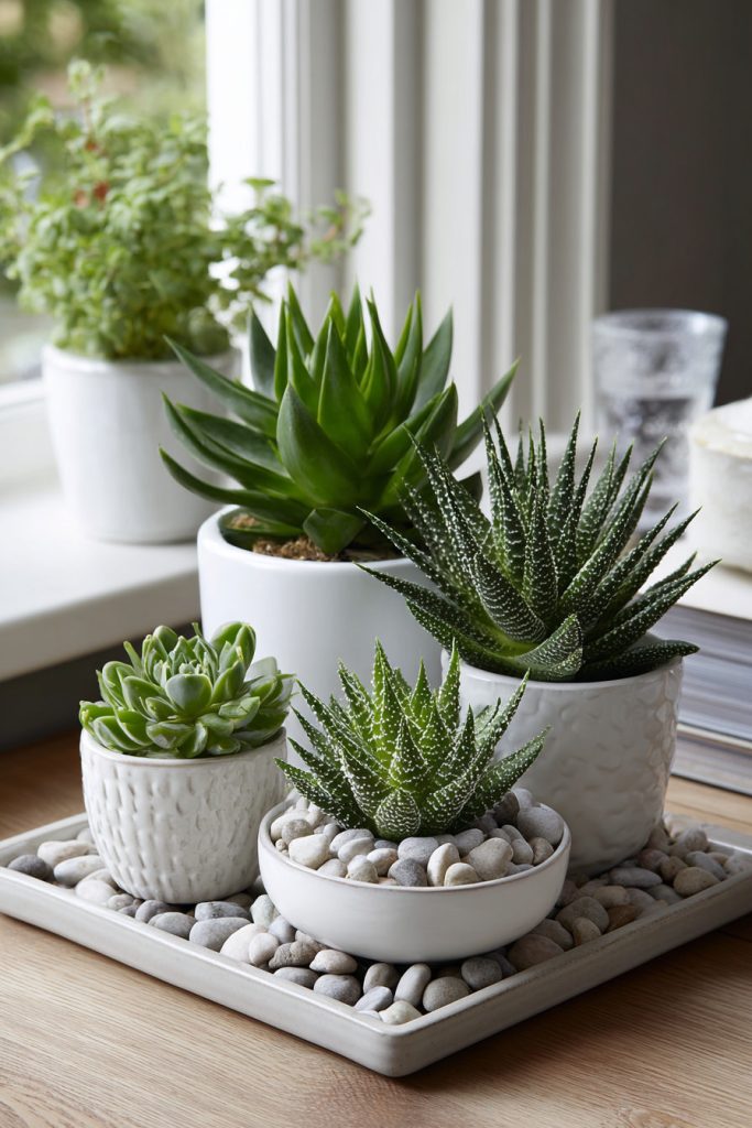 You can brighten small indoor spaces with clusters of miniature aloe and haworthia plants. These succulents are easy to care for and don’t need much water.